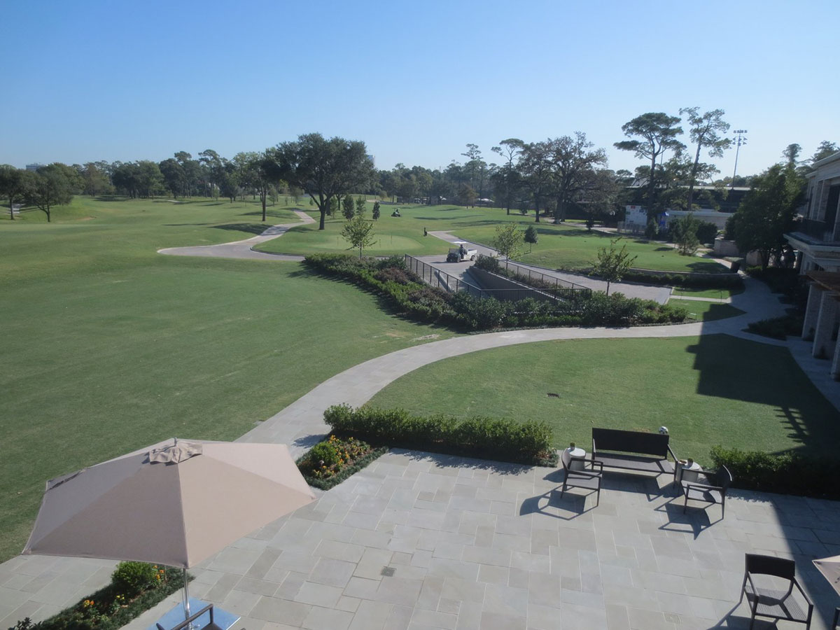 The John F. Staub designed clubhouse sits at the end of River Oaks Blvd.