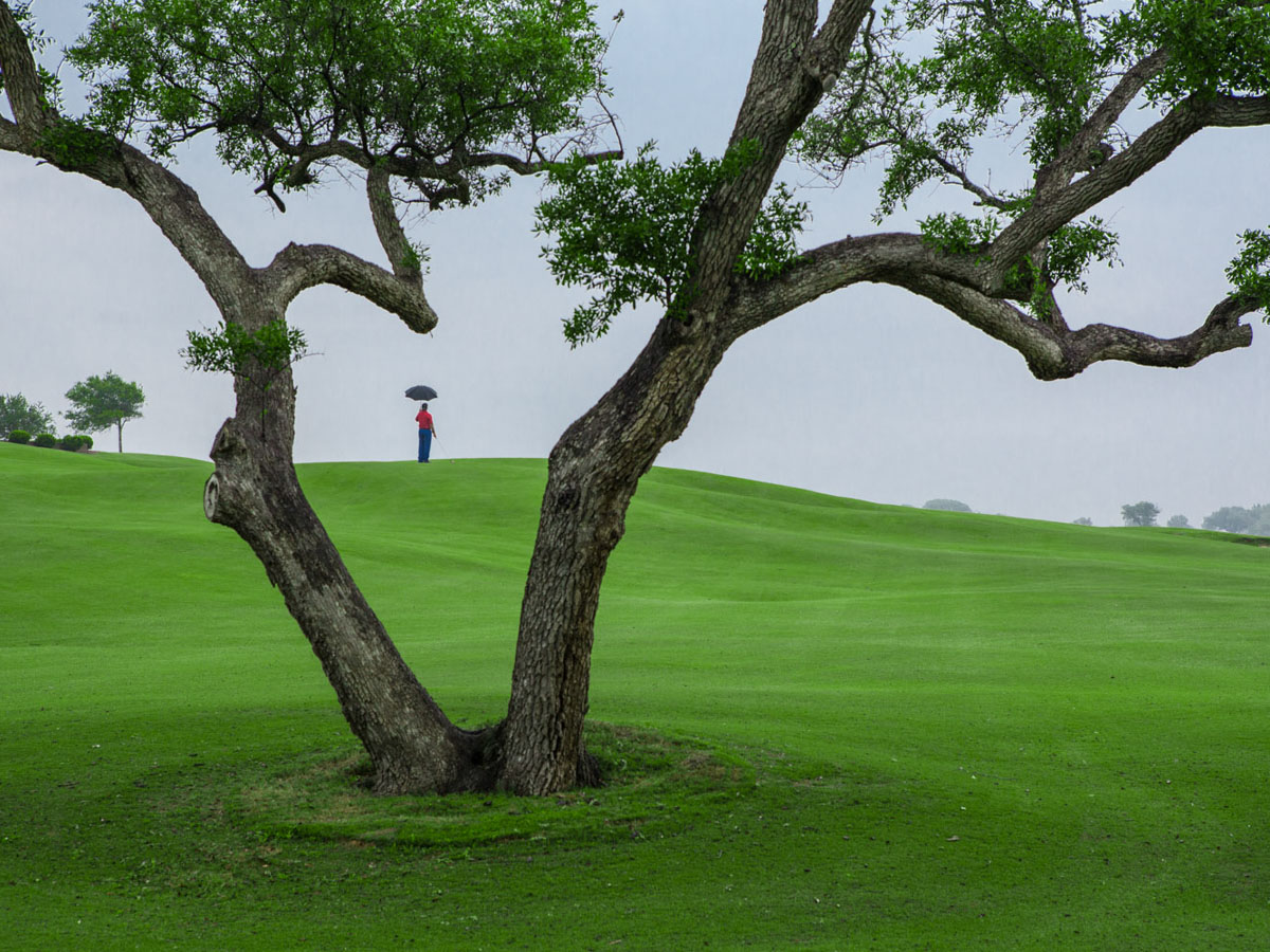 Looking back on the 14th hole, the large live oak splits the fairway.