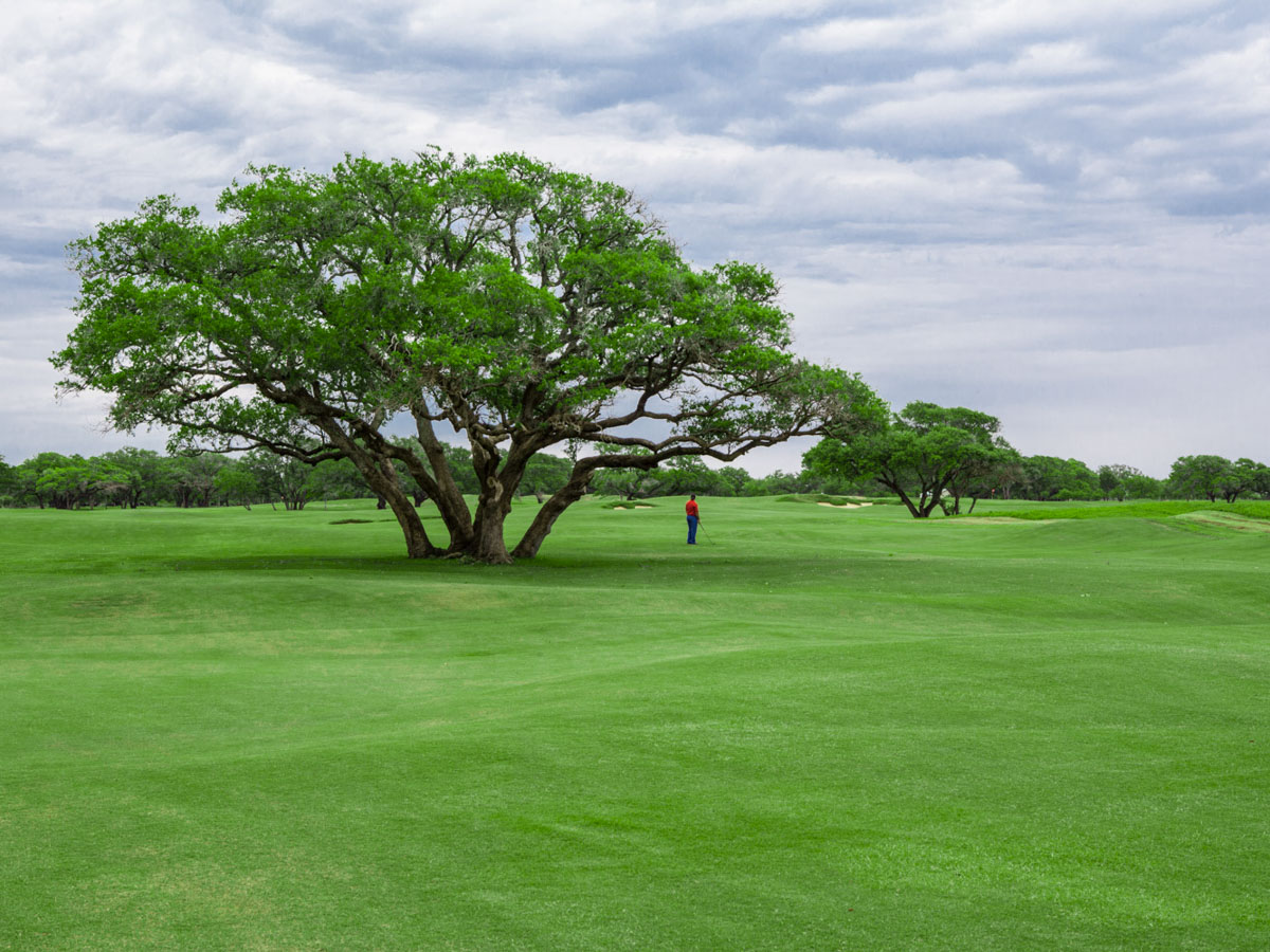 Looking back on the 14th hole, the large live oak splits the fairway.